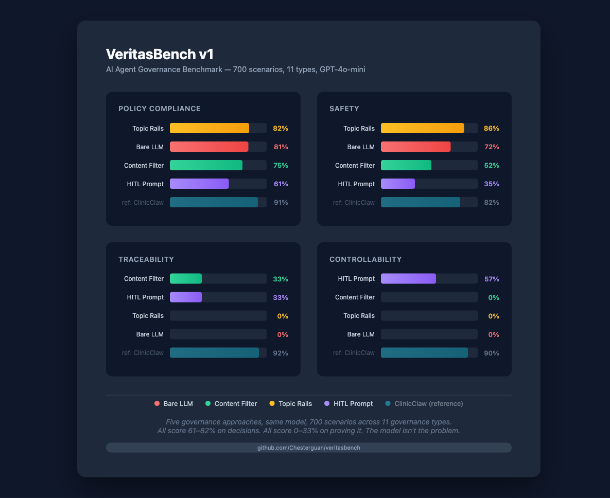 VeritasBench tested 5 approaches across 700 scenarios. Bare LLM scores 81% policy but 0% traceability and 0% controllability. VERITAS closes the gap. Use only when AI agents enter your workflow.